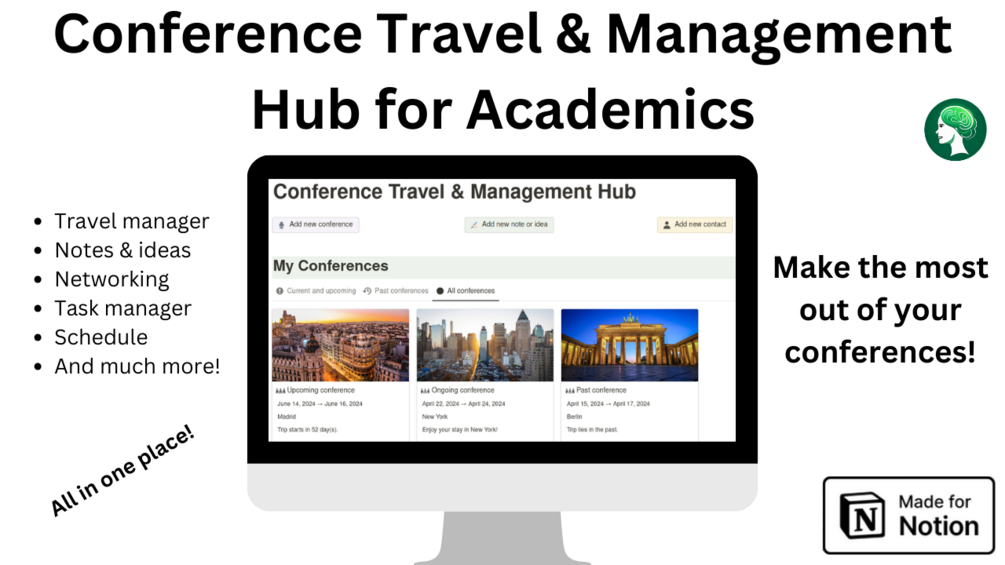 The Conference Travel and Management Hub for Academics is the system I wish I had when I first started attending academic conferences in 2009. Since then, I have been to many conferences, and I built this template with all my experiences and observations in mind.